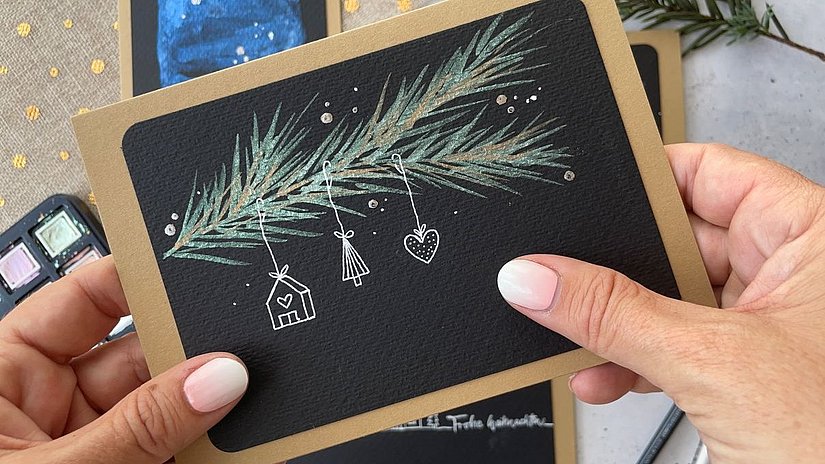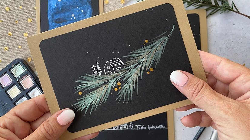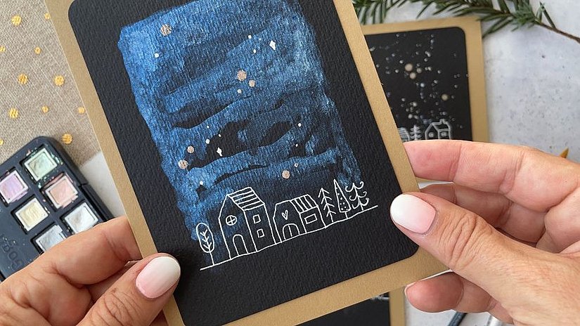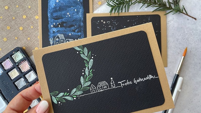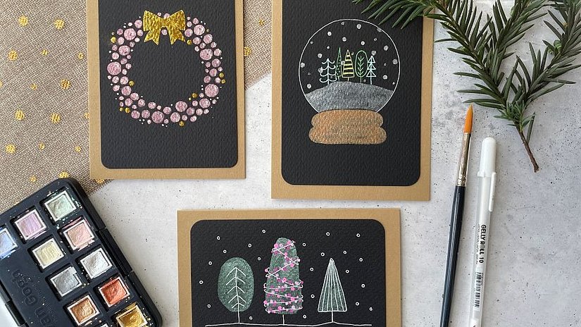 Mit hochwertigen Metallic-Aquarellfarben malst du schimmernde Tannen, Himmel, Kränze oder Schneekugeln. Ich zeige dir wie du mit Gelstiften feine, kleine Details zeichnest, während du mit Letterings per Hand oder mit Stempeln liebevolle Schriftzüge auf die Karten bringst.