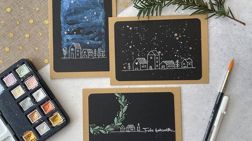 In diesem Adventsworkshop gestaltest du - egal ob du erst anfängst oder schon länger kreativ bist - einzigartige Weihnachtskarten mit winterlichen Glitzer- und Glanzmotiven auf edlem schwarzem Papier.